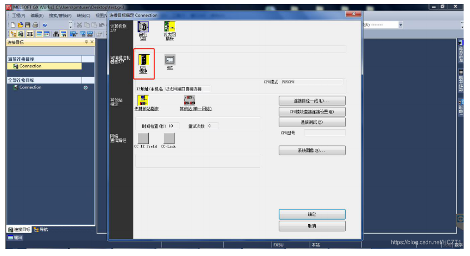 打开GXWORKS 3,点击当前连接目标下的【Connetion】,连接目标选择【其他连接方式】