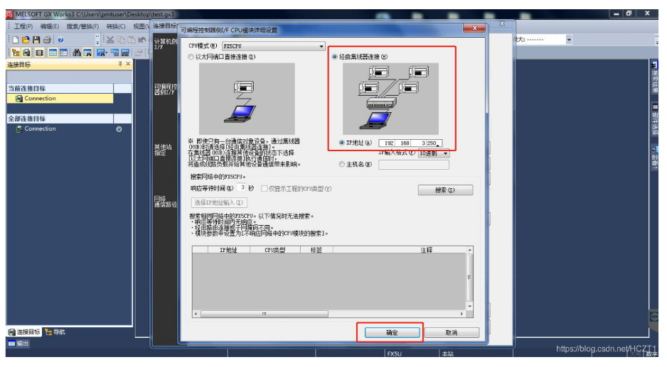 选择【经由集线器连接】,输入PLC的IP地址后点击【确定】。
