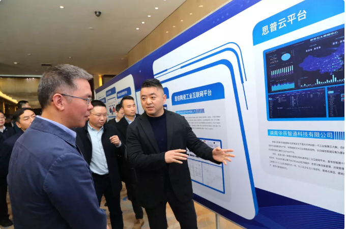 • 巅峰国际智通总经理傅帝向湖南省工业和信息化厅党组书记、厅长曹慧泉介绍思普云在工业领域应用情况